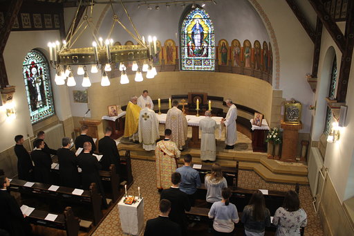U četvrtak, 23. svibnja 2019., u kapeli Bezgrješnog začeća Blažene Djevice Marije Bogoslovnog sjemeništa u Đakovu služena je Božanska liturgija svetog Ivana Zlatoustog prema bizantsko-slavenskom obredu kojim se služe grkokatolički vjernici na području Križevačke eparhije. Liturgiju je služio o. Aleksandar Hmilj, župnik u Slavonskom Brodu i Gornjim Andrijevcima, uz suslavitelje o. Nikolu Stupjaka, župnika u Kaniži i Šumeću te vlč. Stjepana Maroslavca, svećenika biritualca na službi u Đakovu. Njima su se u koncelebraciji pridružili poglavari Bogoslovnog sjemeništa, mons. Karlo Višaticki, duhovnik, preč. Mato Gašparović, ekonom te vlč. Krešimir Čutura, vicerektor Sjemeništa. Na liturgiji je posluživao i vlč. Domagoj Vidaković, đakon Đakovačko-osječke nadbiskupije koji je i navijestio evanđelje po ukrajinskom napjevu. U prvom dijelu propovijedi, o. Aleksandar nas je uveo u slavljenje blagdana po bizantskom običaju.