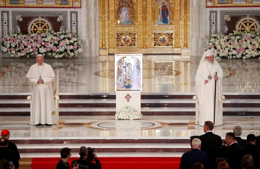 Nakon susreta sa Stalnim sinodom Rumunjske pravoslavne Crkve, papa Franjo je u petak 31. svibnja poslijepodne otišao u novu, još nedovršenu, pravoslavnu katedralu Spasa naroda u Bukureštu, gdje je održana molitva Očenaša. "Molimo Te i kruh sjećanja, milost da ojačamo zajedničke korijene našega kršćanskog identiteta, korijene prijeko potrebne u vremenu u kojemu bi se čovječanstvo, a posebno mladi naraštaji, mogli osjetiti iskorijenjeni" - rekao je papa. Papa Franjo će u nedjelju u Blaju predvoditi Božansku liturgiju sv. Ivana Zlatoustog i proglasiti blaženima sedam grkokatoličkih biskupa mučenika, stradalih za vjeru i jedinstvo Crkve u Rumunjskoj u vrijeme komunističke diktature.