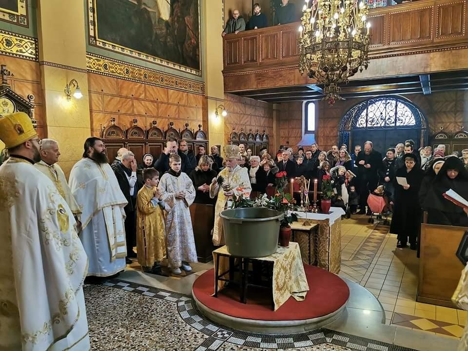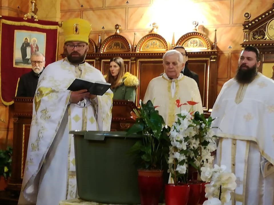 da posveti i obnovi nas i cijelu prirodu koja nas okružuje te, kako nas papa Franjo stalno poziva, ne ranjavati ni svoje besmrtne duše, ni Božja stvorenja, ni prirodu, jer je sve to dar Božji za dobro ljudi”. Pozdravio je sve tradicionalnim bogojavljenskim pozdravom: "Krist se javi! Uistinu se javi!" Naime, kako pjeva glavni tropar blagdana: "Kad si se, Gospode, krstio na Jordanu, objavila se Trojica dostojna klanjanja. Jer Očev glas svjedočiše za tebe, nazivajući te ljubljenim Sinom, a Duh u liku goluba potvrđivaše istinitost riječi. Objavio si se, Kriste Bože, i prosvijetlio svijet...". Nakon blagoslova vode poškropljena je cijela crkva, oltar, ikone i sav okupljeni narod Božji. (Foto: D. Hranilović i Z. Galić)