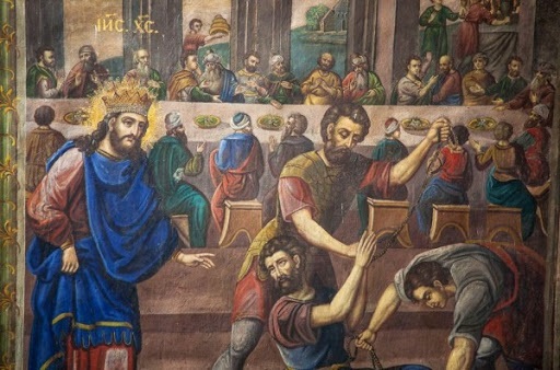 U ono vrijeme Isus prozbori svećeničkim glavarima i starješinama naroda u prispodobama: "Kraljevstvo je nebesko kao kad neki kralj pripravi svadbu sinu svomu. Posla sluge da pozovu uzvanike na svadbu. No oni ne htjedoše doći. Opet posla druge sluge govoreći: 'Recite uzvanicima: Evo, objed sam ugotovio. Junci su moji i tovljenici poklani i sve pripravljeno. Dođite na svadbu!' Ali oni ne mareći odoše - jedan na svoju njivu, drugi za svojom trgovinom. Ostali uhvate njegove sluge, zlostave ih i ubiju. Nato se kralj razgnjevi, posla svoju vojsku i pogubi one ubojice, a grad im spali. Tada kaže slugama: 'Svadba je, evo, pripravljena ali uzvanici ne bijahu dostojni. Pođite stoga na raskršća i koga god nađete, pozovite na svadbu!' Sluge iziđoše na putove i sabraše sve koje nađoše - i zle i dobre. I svadbena se dvorana napuni gostiju. Kad kralj uđe pogledati goste, spazi ondje čovjeka koji ne bijaše odjeven u svadbeno ruho. Kaže mu: 'Prijatelju, kako si ovamo ušao bez svadbenoga ruha?' A on zanijemi. Tada kralj reče poslužiteljima: 'Svežite mu ruke i noge i bacite ga van u tamu, gdje će biti plač i škrgut zubi.' Doista, mnogo je zvanih, malo izabranih."