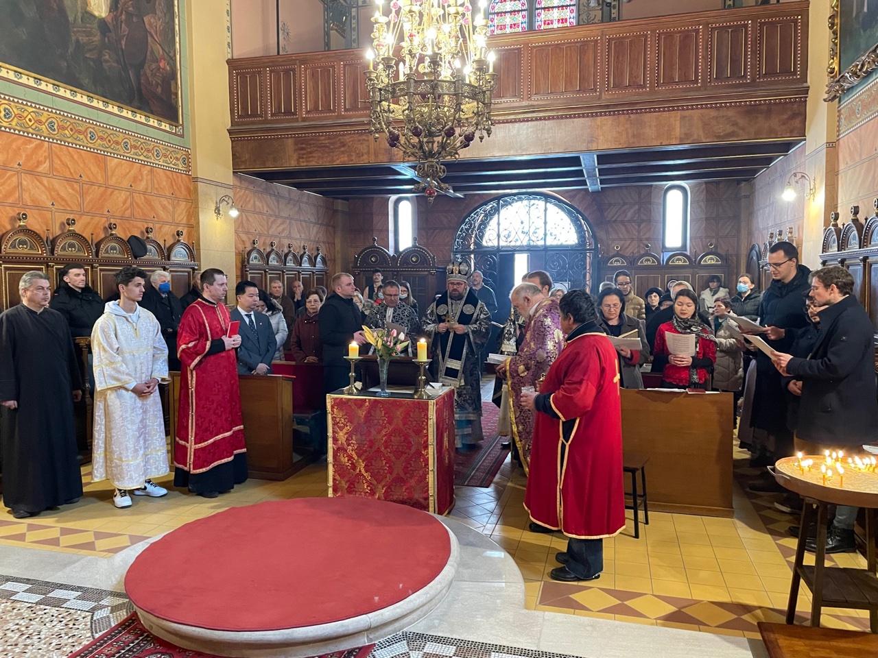ZAGREB (IKA) 12.03.2022. / 17:23: Na drugu Zadušnu subotu, 12. ožujka, križevački biskup Milan Stipić predvodio je arhijerejsku liturgiju u konkatedrali Sv. Ćirila i Metoda na zagrebačkom Gornjem gradu. Vladika Stipić u propovijedi je naglasio kako je u vremenu Velikog posta u istočnoj Crkvi stavljen naglasak na to molitveno da se kroz pet zadušnih subota prisjeća preminulih roditelja, braće, sestara i drugih dragih osoba. Povezanost zemaljske i nebeske Crkve potiče nas da kroz molitvu, post i činjenje dobrih djela svoje duše pripremamo na blagdan Kristova uskrsnuća, poručio je križevački vladika. Liturgiju je predvodio u koncelebraciji sa zagrebačkim grkokatoličkim župnikom i biskupskim vikarom Danielom Vranešićem, križevačkim katedralnim župnikom Mihaelom Simunovićem i stojdraškim župnikom Milanom Vranešićem.