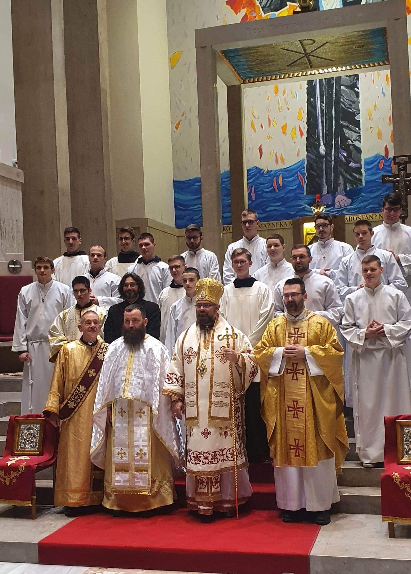koju je pjevao zbor od oko 70 pjevača. S vladikom Milanom suslužili su fra Ivan Lotar OFM Conv, župnik, o. Gorazd Bastašić, đakoni o. Livio Marijan i o. Antonije Pajić, a posluživali franjevački novaci i postulanti. Velebni zbor sastavljen od pjevača akademskog zbora Ivana Gorana Kovačića generacije maestra Kranjčevića (1974-1987), Zbora Križevačke katedrale, Ćirilo-Metodova kora konkatedrale iz Zagreba, Hrvatskog pjevačkog društva Kalnik iz Križevaca i drugih, izvodio je "Liturgiju sv. Ivana Zlatoustog" skladatelja Stevana St. Mokranjca pod vodstvom maestra Ozrena Bogdanovića, a "Otče naš" je uz pratnju zbora otpjevala sopranistica Hrvatskog narodnog kazališta Lidija Horvat Dunjko. Bazilika je bila posve ispunjena za ovu jedinstvenu liturgiju, za koju je na kraju biskup Stipić kazao da je svojevrstan dar grkokatolika ovoj crkvi sv. Antuna povodom njezina proglašenja manjom bazilikom, ali je i poseban ekumenski događaj jer se grkokatolička liturgija služi u rimokatoličkoj crkvi na napjevima koje je skladao pravoslavac Mokranjac. "U društvu i svijetu gdje se sve više dijeli i razdvaja, evo mi poslušni Bogu koji je ljubav, spajamo i okupljamo se" naglasio je biskup Milan. Župnik fra Ivan na kraju se zahvalio svima na ovakvom bogatom duhovnom događaju.