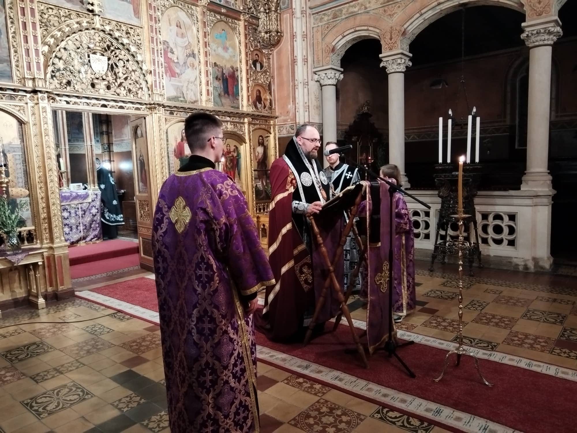 Vladimir Simunović, eparhijski kancelar, jeromonah o. Andrij Savyak, dušobrižnik za raseljene Ukrajince, o. Zoran Vladušić, župnik u Sošicama i Kaštu te jerođakon o. Antonije Pajić. U homiliji je vladika Stipić govorio o velikoj Božjoj ljubavi prema čovjeku iz koje nam je poteklo veliko otajstvo Euharistije u kojoj je Kirst s nama ovdje na zemlji do svršetka svijeta. ''Budimo uvijek svjesni toga neizmjernoga dara i budno pazimo da s doličnim poštovanjem pristupamo ovom sakramentu ljubavi našega Boga. Tijekom ove liturgije više puta pjevamo tropar: Za pričesnika tvoje Otajstvene večere, primi me danas Sine Božji, jer ja neću izdati tajnu tvojim neprijateljima, niti ću ti poljubac dati kao Juda, već te kao razbojnik ispovijedam: Spomeni se mene, Gospode, kada dođeš u Kraljevstvo svoje. Uistinu ''odati tajnu'' znači izdati Krista, njegovo Evanđelje i njegovu ljubav u svakodnevnom životu kojega živimo. Ne budimo poput Jude, već budimo istinski Isusovi učenici, vjerni njegovu nauku i dostojni njegove velike ljubavi, a to ćemo biti ako živimo u bogoljublju i čovjekoljublju. Sudjelovati na Euharistiji je za kršćanina neupitno, ono je čast i radost u kojima se na najintimniji način susreću Bog i čovjek. Iz Euharistije crpimo snagu za život i postaje miomiris u ovome svijetu koji je toliko potreban ljubavi, dobrote i milosrđa. Ako to mi kršćani ne možemo dati ovome svijetu, mi koji se u pričesti sjedinjujemo sa samim Bogom, tko će onda?'' rekao je vladika Stipić. U kasnijim večernjim sati u vladika Stipić je sa svećenstvom služio Jutrenju Muke Gospodnje Velikoga petka na kojoj se čitaju Evanđelja o muci i smrti Kristovoj podijeljeni u četrnaest odlomaka a između kojih se pjevaju antifoni, stihire i tropari koji na pjesničkio-dogmatski način pjevaju o Kristovoj patnji i stradanju za čovječanstvo.