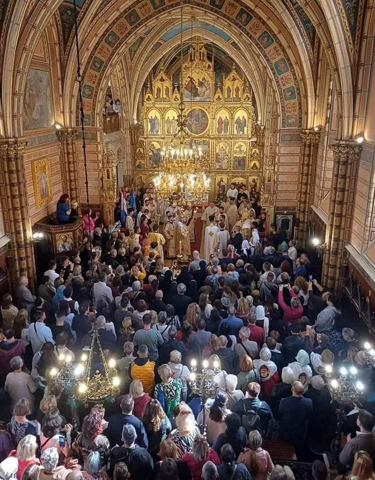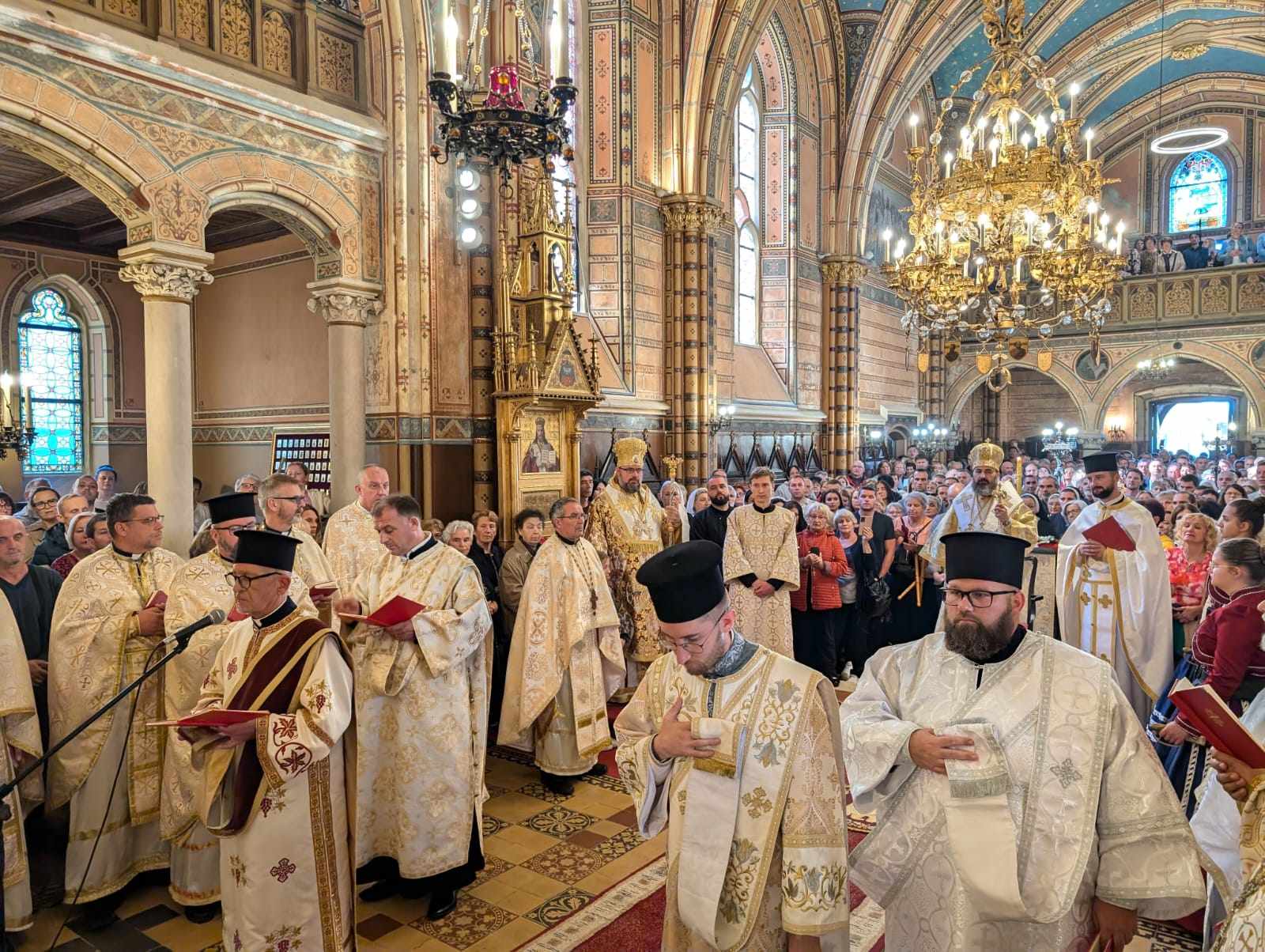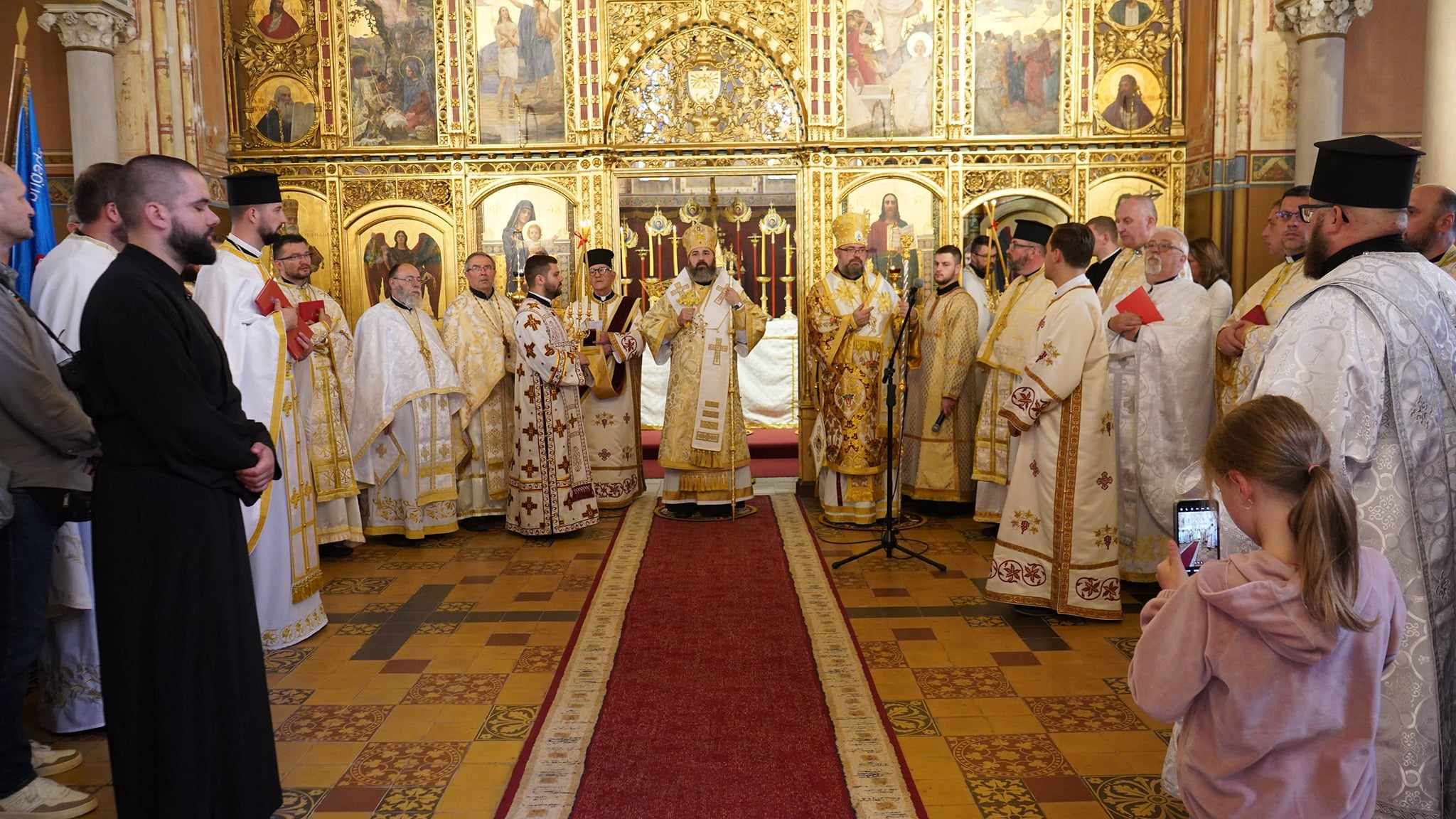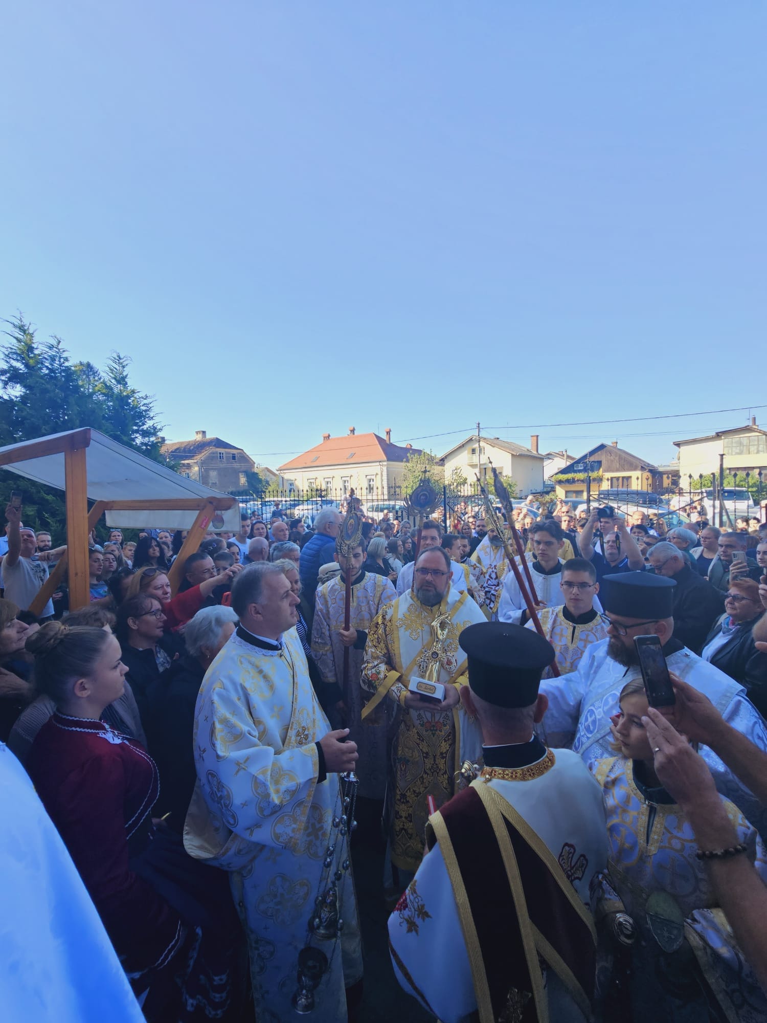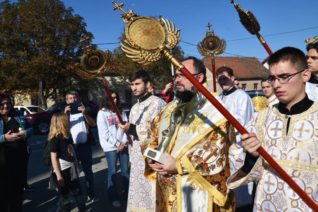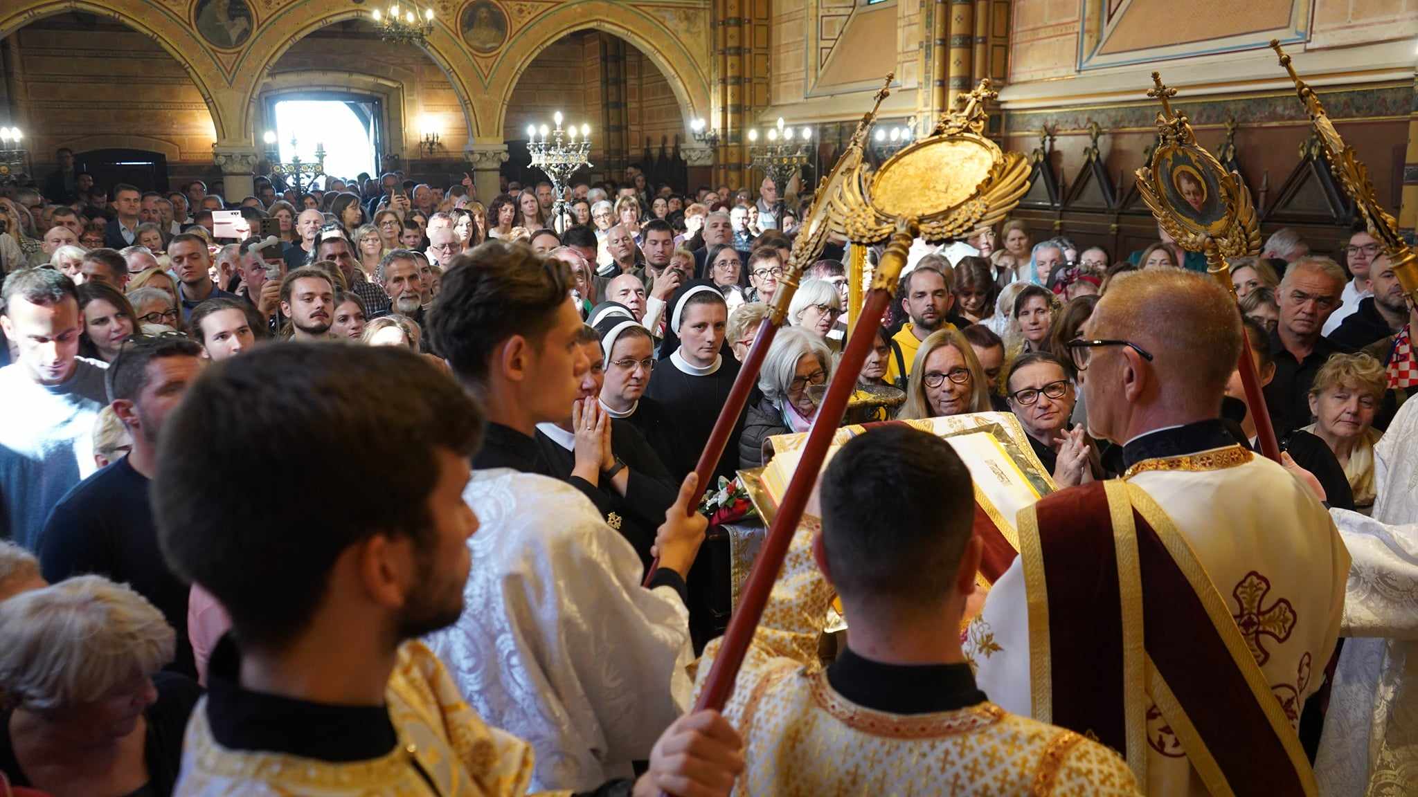 svečanoj procesiji iz kapele Samostana sestara Bazilijanki, uz svečanu zvonjavu svih zvona katedrale, u rukama nosio križevački vladika Milan Stipić, u pratnji prešovskoga nadbiskupa i metropolita Grkokatoličke Crkve u Slovačkoj vladike Jone Maksima, brojnog svećenstva, đakona, podđakona, poslužitelja, bogoslova i časnih sestara. U katedrali i oko nje okupilo više od 1500 vjernika i hodočasnika iz svih krajeva Hrvatske. Prije početka arhijerejske liturgije, vladika Milan je postavio relikvijar na prijestolje, nasuprot biskupske katedre. Arhijerejsku božansku liturgiju sv. Ivana Zlatoustoga predslavio je prešovski nadbiskup i metropolita vladika Jona, uz susluženje vladike Stipića i brojnoga svećenstva, uz služenje četvorice đakona i više podđakona i poslužitelja. Liturgiju su pjevali dijelom bogoslovi Grkokatoličke bogoslovije iz Prešove, bogoslovi iz Nyiregyhaze u Mađarskoj te Katedralni zbor iz Križevaca, a liturgija je služena na hrvatskom i staroslavenskom jeziku. Podijeljeno je preko 1200 pričesti.