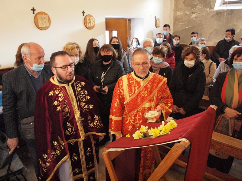 jer je Kristova smrt na križu blagoslovila, posvetila i osmislila sve naše patnje i muke. Križ je nada i putokaz da se kroz žrtvu dolazi do uskrsnuća, uspjeha i pobjede'' rekao je vladika Milan. ''Bit je posta da želimo promijeniti nešto u svom životu, naše zle navike, da se suočimo sa svojom naravi ljudskom, koja je pala i grešna. Treba pobijediti one zle sile koje su u nama, u našem karakteru, iz čega proizlaze i naše životne muke, posebno u odnosu s bližnjima. Sve je to muka i trpljenje života. A upravo ova nedjelja, koja stoji usred Velikoga posta, kao drvo života usred pustinje, poziva nas da se zagledamo u križ, da nam dadne snage za život i dovede nas u život vječni'' - rekao je vladika Milan. Na kraju se zahvalio Zadarskom nadbiskupu mons. Želimiru Puljiću na ustupljenoj crkvi, zatim župi sv. Ante, Zadar-Smiljevac, na čijem se području ova crkva nalazi, pjevačima, udrugama Rusina i Ukrajinaca, zadarskim medijima i Laudato televiziji te svećenicima i đakonima koji su suslužili. Preporučio je vjernicima da se obrate za sve pastoralne potrebe đakonu Liviju Marijanu koji će u suradnji sa župnikom Marjanom Jeftimovim voditi pastoralni život ove nove zajednice u Zadru. Na kraju svete Liturgije vjernici su se poklonili sv. Križu. Poslije službe, uslijedila je okrjepa i druženje uz pjesmu okupljenih vjernika u prostranom i ograđenom dvorištu crkve. Bogoslužje je popratila snimkom i prilogom Laudato televizija. Župnik o. Marjan Jeftimov najavio je da će se sljedeća liturgija služiti na Uskrsni ponedjeljak, 5. travnja, u 18 sati. (Foto: Ines Grbić, Zadarska nadbiskupija)