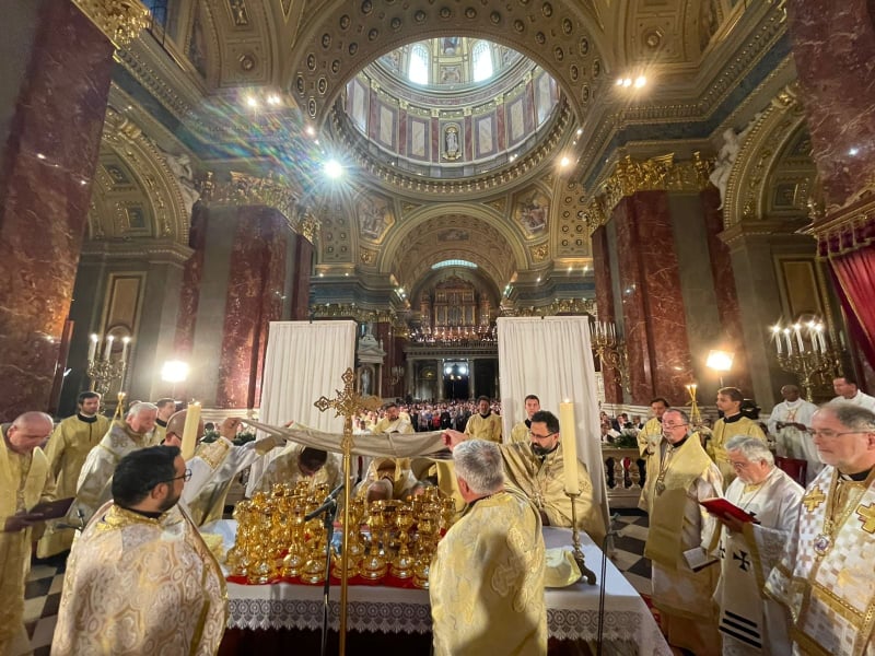 biskup Piane degli Albanesi iz Italije (Sicilija) te predsjednik Vijeća europskih biskupskih konferencija kardinal Angelo Bagnasco, umirovljeni nadbiskup Genove. Susret, koji se svake godine održava u drugoj zemlji, ove je godine održan u Budimpešti upravo u kontekstu svjetskog euharistijskog kongresa i pohoda pape Franje koji će u nedjelju 12. rujna slaviti svečano misno slavlje na Trgu heroja u Budimpešti i zaključiti kongres. Na susretu su biskupi i predstavnici istočnih katoličkih Crkava slušali predavanja i razgovarali o temi Euharistije i sinodalnosti. Uvodno predavanje održao je kardinal Bagnasco koji je govorio o nezamjenjivoj važnosti Euharistije i euharistijskog okupljanja u crkvi, što je osobito došlo do izražaja u vrijeme pandemije Covida-19 kada su mnogi kršćani morali živjeti bez sudjelovanja u euharistijskom slavlju. Naglasio je: ''Crkva ne treba biti moderna, ali treba biti aktualna'' te donositi Krista, njegovu ljubav i blizinu u konkretnom vremenu i prostoru u kojem današnji kršćani žive. Završno predavanje o sinodalnosti održao je veliki nadbiskup kijevsko-galicijski Ukrajinske grkokatoličke Crkve Njegovo Blaženstvo Svyatoslav Shevchuk, iznijevši primjer života i rada sinode Ukrajinske grkokatoličke Crkve kao zajedničkog tijela biskupa koje brine o svim aspektima života ove velike mjesne grkokatoličke Crkve. Sudionici su imali prigode izložiti stanje i prilike u svojim mjesnim Crkvama obzirom na slavljenje euharistije, osobito s iskustvima u vrijeme pandemije. Ispred Križevačke eparhije izlaganje je održao đakon Livio Marijan. Tijekom susreta održana su brojna slavlja Božanskog časoslova, a uoči blagdana Rođenja presvete Bogorodice – Male Gospe, održano je blagdansko bdjenje – Večernja s litijom u župnoj crkvi grada Gödöllö, gdje je okupljene biskupe pozdravio i predstavnik mađarske vlade. Biskupi, svećenici i đakoni istočnih katoličkih Crkava sudjelovali su na velikom misnom slavlju otvorenja euharistijskog kongresa na Trgu heroja u nedjelju, 5. rujna, kojega je predslavio kardinal Angelo Bagnasco, a na kojem je sudjelovalo preko stotinu biskupa iz cijeloga svijeta i na deseci tisuća vjernika. Na blagdan Rođenja Marijina – 8. rujna, slavljena je svečana liturgija sv. Ivana Zlatoustog u Bazilici sv. kralja Stjepana Ugarskog, najpoznatijoj budimpeštanskoj crkvi i katedrali, kojoj je glavni služitelj bio melkitski grkokatolički patrijarh Antiohije Youssef Absi, u zajedništvu s maronitskim katoličkim patrijarhom Antiohije kardinalom Becharom Rai, siro-kaldejskim katoličkim patrijarhom Iraka Louisom Rafaelom Sako, kardinalom Bagnascom i brojnim grkokatoličkim i rimokatoličkim metropolitima nadbiskupima, biskupima, svećenicima i đakonima, a u nazočnosti više tisuća vjernika koji su ispunili baziliku i prostor ispred i oko nje. Na liturgiji su odzvanjali grčki, mađarski, staroslavenski, engleski, arapski i ukrajinski jezik te razni napjevi u izvedbi velikog zbora od stotinu pjevača. Ekteniju na grčkom i engleskom pjevao je đakon Križevačke eparhije Livio Marijan. Liturgiju je prenosila mađarska nacionalna televizija. Milostinja skupljena na ovom slavlju namijenjena je pomoći Crkvama na Bliskom Istoku koje proživljavanju osobito teške dane i gdje su kršćani ugroženi u svom identitetu i opstojnosti na prostorima gdje su prisutni od samih početka kršćanstva. Na kraju susreta istočni katolički biskupi izdali su i posebno priopćenje koje će se naknadno u cijelosti objaviti, a koje stavlja naglasak na važnosti Euharistije i svete liturgije za život kršćana i kršćanskih zajednica. ''Kao što su prvi kršćanski mučenici svjedočili za prva kršćanska vremena, i danas ostaje najveća svetinja za sve kršćane Euharistija, bez koje nema ni Crkve, ni zajednice kršćana, ni Kristove prisutnosti u svijetu'' naglasili su biskupi katoličkih Crkava istočnih obreda na prostoru Europe. Dogovoreno je da idući susret istočnih katoličkih biskupa bude dogodine u Armeniji. Biskupi su izrazili osobitu radost što će papa Franjo na blagdan Uzvišenja svetoga Križa, 14. rujna, u sklopu pohoda Slovačkoj, predsjedati Božanskoj liturgiji sv. Ivana Zlatoustoga na kojoj će se osobito okupiti biskupi, kler i vjernici grkokatolici Slovačke i okolnih zemalja.