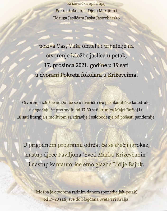U petak, 17. prosinca 2021. godine, Križevačka eparhija u suradnji s Pokretom fokolara ''Mariapoli Faro'' u Križevcima, Udrugom jasličara ''Jaska'' - Jastrebarsko i Križevačkim likovnim krugom ''Zima'', a u organizaciji Ureda za crkvenu glazbu, umjetnost i kulturna dobra Križevačke eparhije, u prostorima katedralnog kompleksa u Križevcima, otvara izložbu jaslica i slika s motivima Kristova rođenja križevačkog slikarskog kruha ''Zima''. Nastupit će djeca Paviljona za nezbrinutu djecu ''Sv. Marko Križevčanin'' Križevačke eparhije i etno-kantautorica Lidija Baljuk. Izložba će biti otvorena do Bogojavljenja - Sveta tri kralja. Prije otvorenja, s početkom u 17,30, u grkokatoličkoj katedrali uobičajeno će se moliti krunica i služiti liturgija za prestanak pandemije, što se svakog petka u vrijeme Božićnoga posta održava.